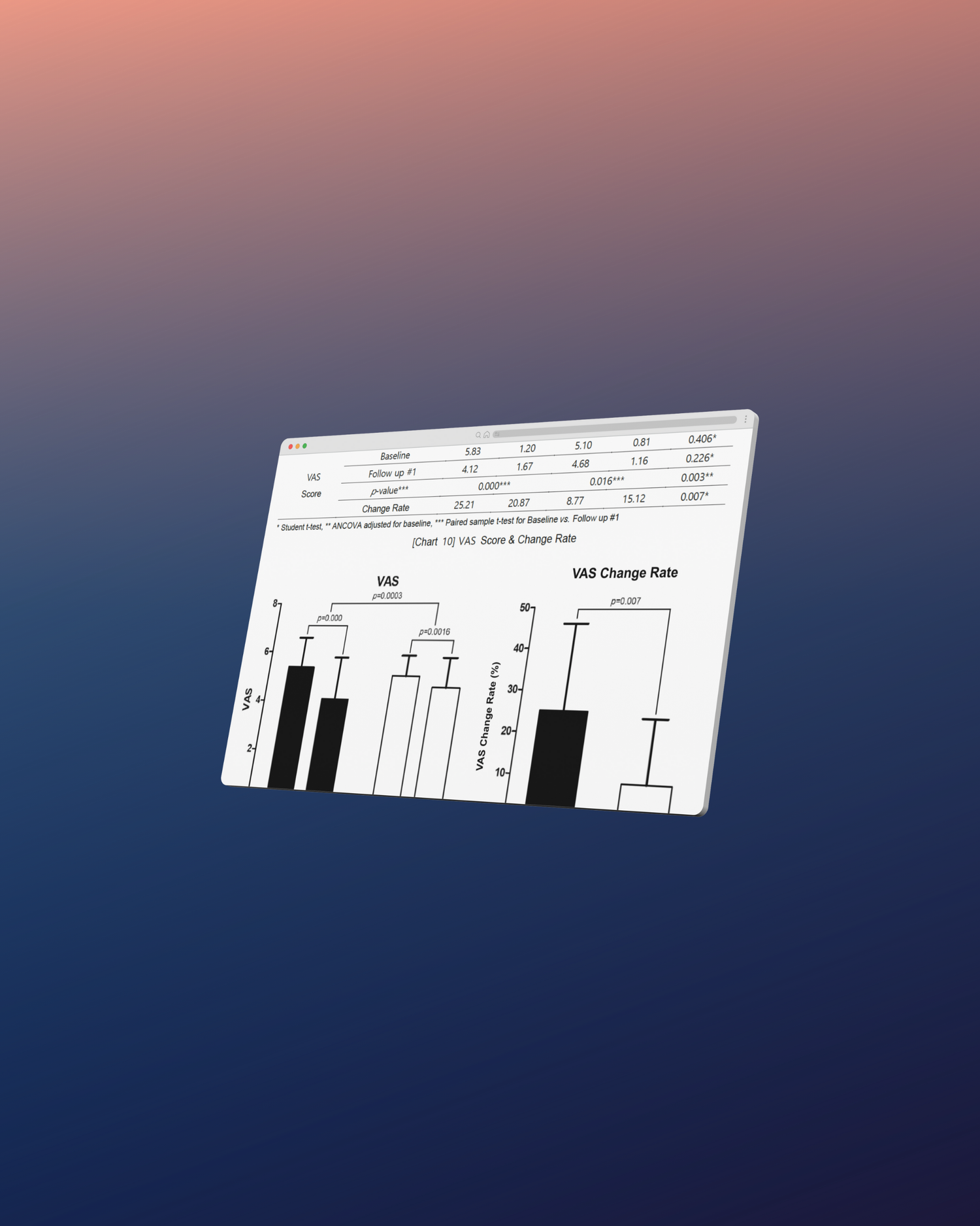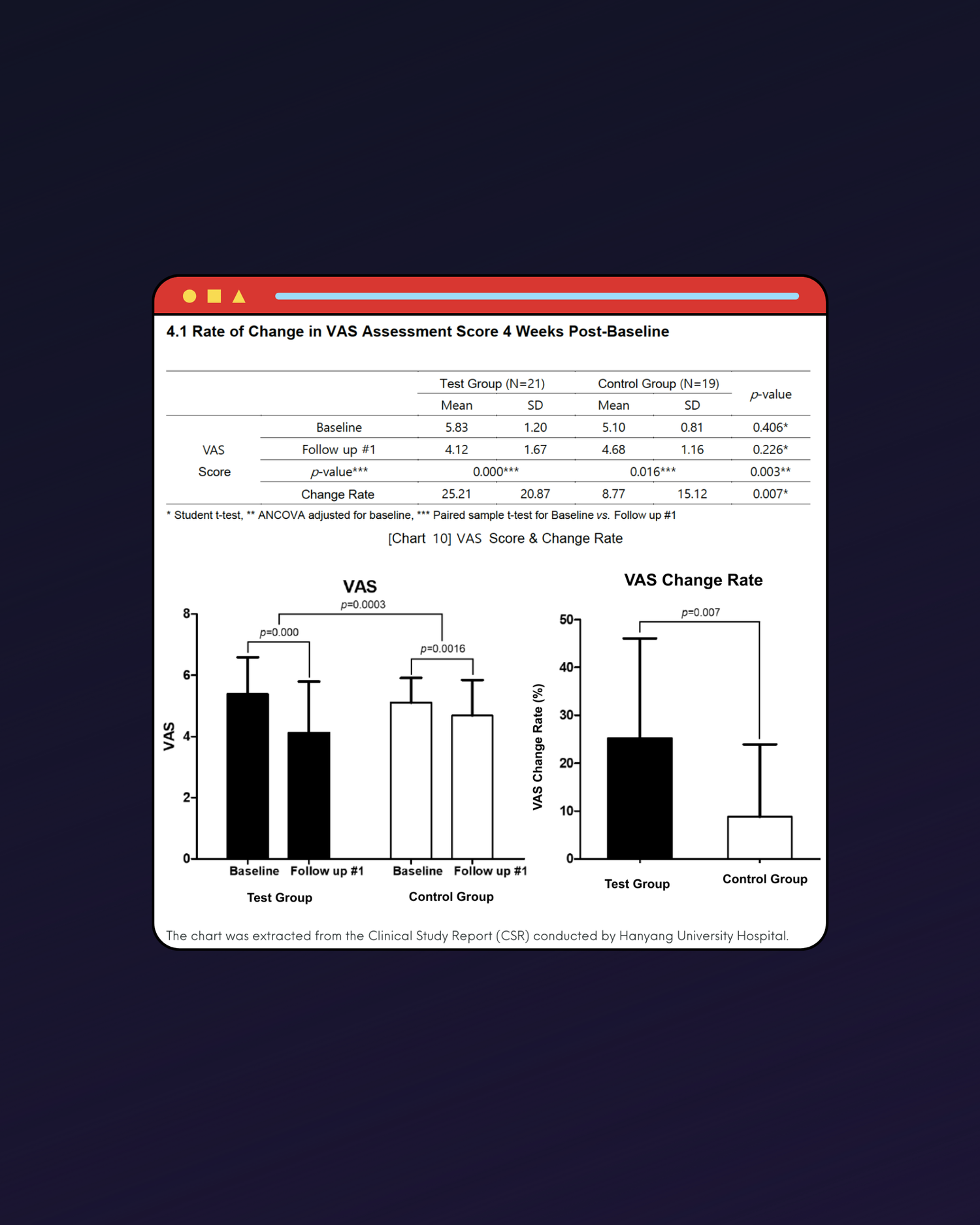 Validated in a randomized, sham-controlled clinical trial at Hanyang University Hospital. The results showed a statistically significant improvement in pain relief (VAS) and overall WOMAC scores compared to the control group.
